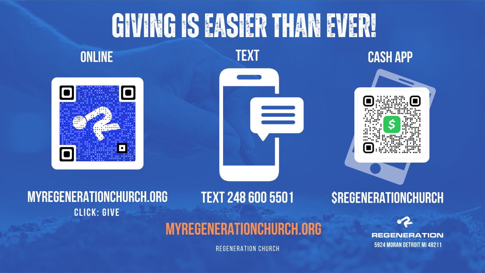 Mail — Send checks to: Regeneration Church, 5924 Moran Street Detroit, MI 48211